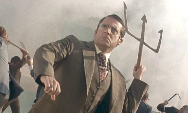 Tim Robbins insisted on the pipe and turtleneck for his character, and Ben Stiller was simply handed a whip and told to figure it out. TheThings Steve Carell was given the trident about three seconds before throwing it. But once they saw the it all put together no one said another word. However the real hero of the scene was prop master, Scott Maginnis, who laid out all the weapons, both modern and medieval, for people to choose the ones that seemed right for their character. Everyone put a lot of consideration into what their news anchor would be brandishing.